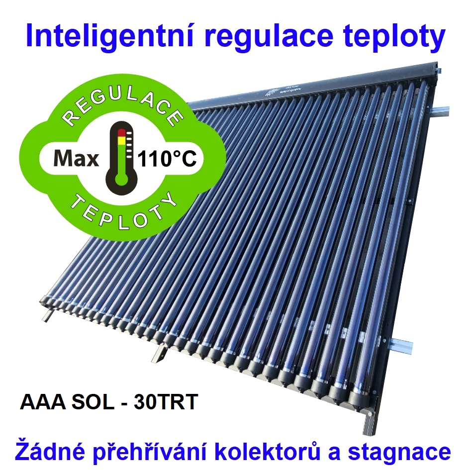 Solární kolektor AAA SOL-30TRT je špičkový výrobek s vysokou účinností a integrovanou regulací teploty. Je vhodný pro celoroční provoz a je určen k ohřevu teplé užitkové vody, ohřevu bazénů i k přitápění. Lze jej namontovat v úhlu od 5° do 90°. Poskytuje vynikající výkon i v zamračených dnech a to proto, že trubice je schopna absorbovat energii z infračervených paprsků, které projdou skrz mraky (difuzní záření). Dalším plusem kolektoru je zrušení nucené údržby, výměny kapaliny, po sedmi letech, protože kapalina se už nebude přepalovat. Lze nyní říci, že efektivita nového trubicového kolektoru oproti plochému kolektoru je o 30% vyšší. Životnost kolektorů je více něž 30 let. Další obrovská výhoda trubicového kolektoru je velmi jednoduchá montáž jedním člověkem, bez speciální techniky.